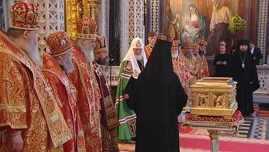 В завершение Святейший Патриарх Кирилл передал настоятельнице Воскресенского Новодевичьего монастыря Санкт-Петербурга игумении Софии (Силиной) ковчег с мощами святителя и чудотворца Николая.