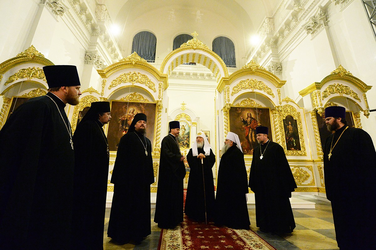 Его Святейшество сопровождали: управляющий делами Московской Патриархии митрополит Санкт-Петербургский и Ладожский Варсонофий; руководитель административного секретариата Московской Патриархии епископ Солнечногорский Сергий; викарии Санкт-Петербургской митрополии: наместник Александро-Невской лавры епископ Кронштадтский Назарий; епископ Царскосельский Маркелл; епископ Гатчинский и Лужский Митрофан.