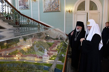 Приветствуя Предстоятеля, наместник Лавры поблагодарил его за всегдашнее внимание к невским святыням, пожелал успешной работы на предстоящем заседании Священного Синода и преподнес созданную в лаврской мастерской к 150-летию со дня рождения святого Серафима Вырицкого икону преподобного с его келейным Казанским образом Божией Матери.