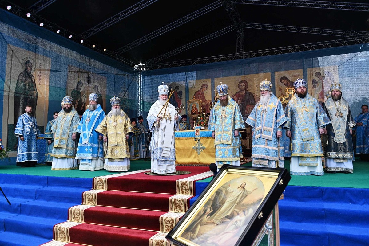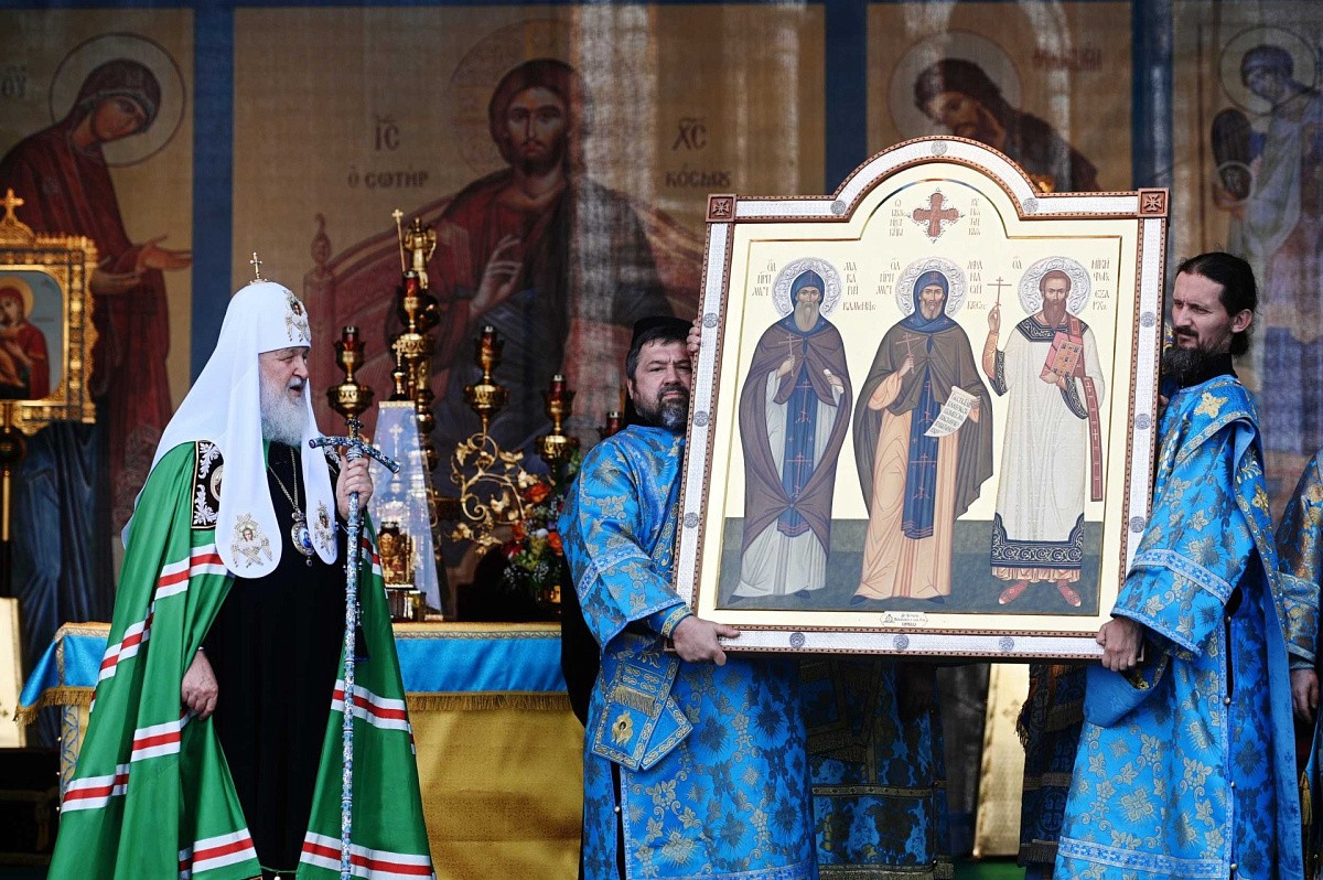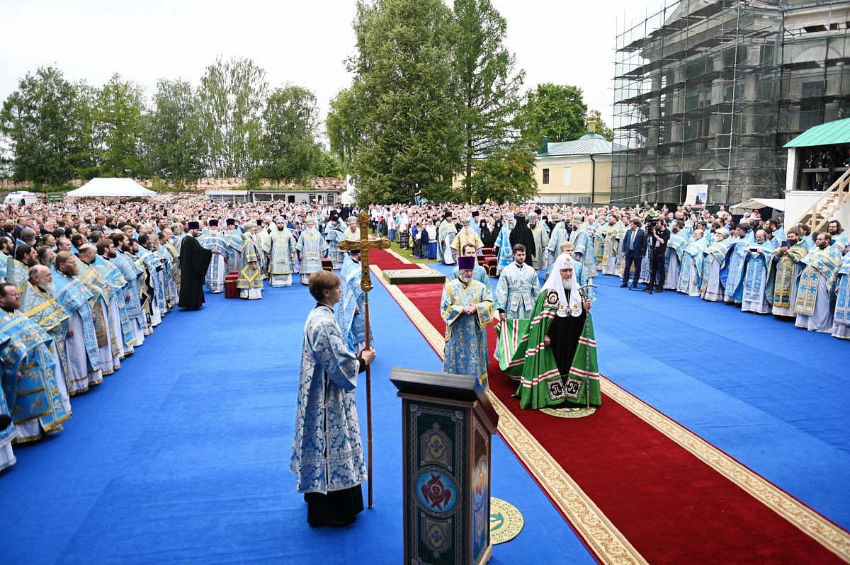 На монастырской площади Святейший Патриарх Кирилл совершил Божественную литургию у престола, установленного под временной сенью близ Борисоглебского собора.