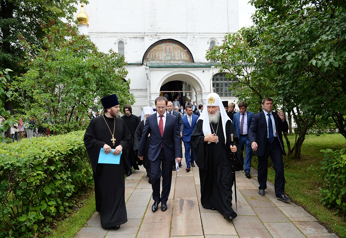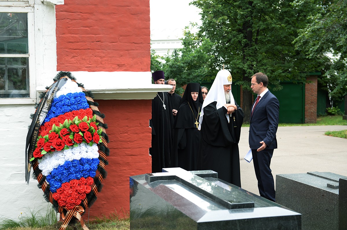 В завершение праздника Святейший Патриарх и прибывший в Новодевичий монастырь министр культуры РФ В.Р. Мединский осмотрели восстановленные Министерством культуры РФ и Российским военно-историческим обществом надгробия генерал-адъютанта генерал-фельдмаршала графа Дмитрия Алексеевича Милютина (1816–1912) и его супруги графини Наталии Михайловны Милютиной (1822–1912) на фамильном участке Милютиных близ Успенского храма Новодевичьего монастыря.