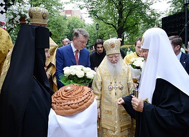 От лица участников богослужения к Святейшему Патриарху Кириллу обратился со словом митрополит Крутицкий и Коломенский Ювеналий, который преподнес Его Святейшеству икону Усекновения главы Иоанна Предтечи – копию образа, который находится в иконостасе воссозданного храма.