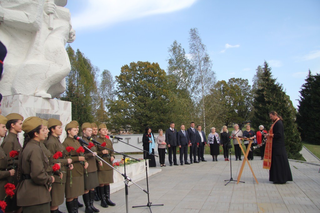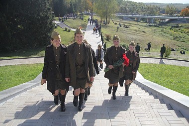 После торжественного открытия и возложения цветов к памятнику у Алешкинского ДОТа мероприятие продолжилось у кургана Славы с памятником подольским курсантам и вечным огнем.