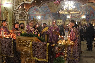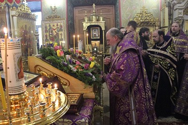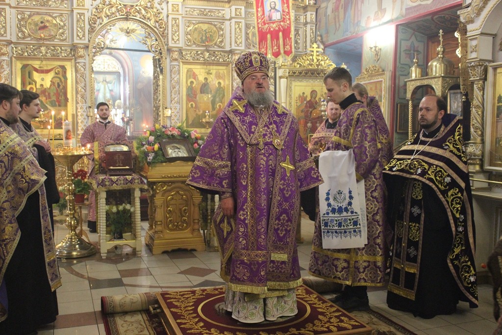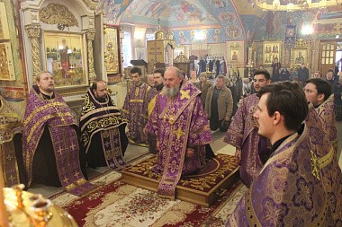 Его Преосвященство с сослужившим духовенством совершили молебен с акафистом Пресвятой Богородице («Взбранной Воеводе победительная...»). Духовенство и верующие коленопреклоненно пропели молитву Пресвятой Богородице «Царице моя преблагая...».