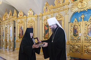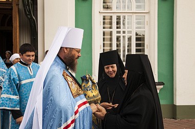 В завершение своего слова митрополит Феодосий выразил благодарность за совместные молитвы и понесенные труды игумении Варваре, которая по сложившейся традиции более десяти лет ежегодно доставляет на Тамбовскую землю святыни Толгской Свято-Введенской обители.
