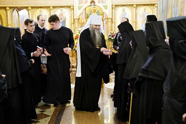 Глава Нижегородской митрополии приложился к святыням обители, благословил ее настоятельницу игумению Филарету (Шевченко) и сестер, поздравил их с праздником Воскресения Христова и вручил им пасхальные подарки.