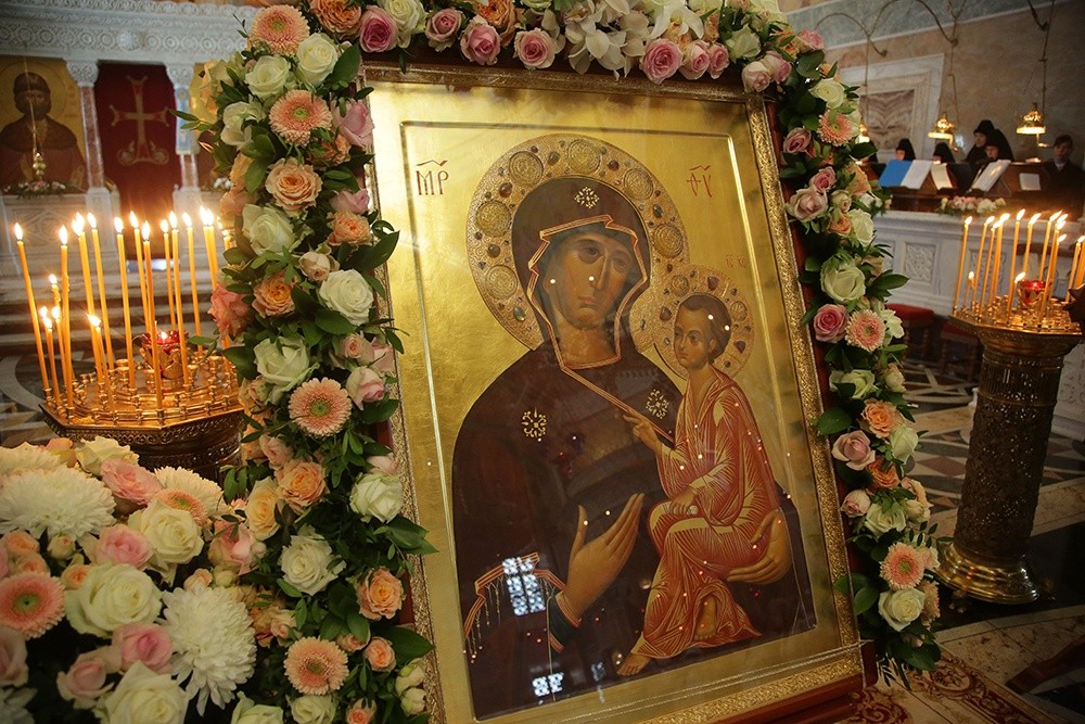 Тихвинская икона Божией Матери, по преданию, одна из икон, написанных святым апостолом и евангелистом Лукой. В V веке из Иерусалима была перенесена в Константинополь, где для нее был построен Влахернский храм. В 1383 году, за 70 лет до взятия турками Константинополя, икона исчезла из храма и в лучезарном свете явилась над водами Ладожского озера. Чудесно носимая с места на место, она остановилась близ города Тихвина. На месте явления иконы был построен деревянный храм в честь Успения Богородицы.