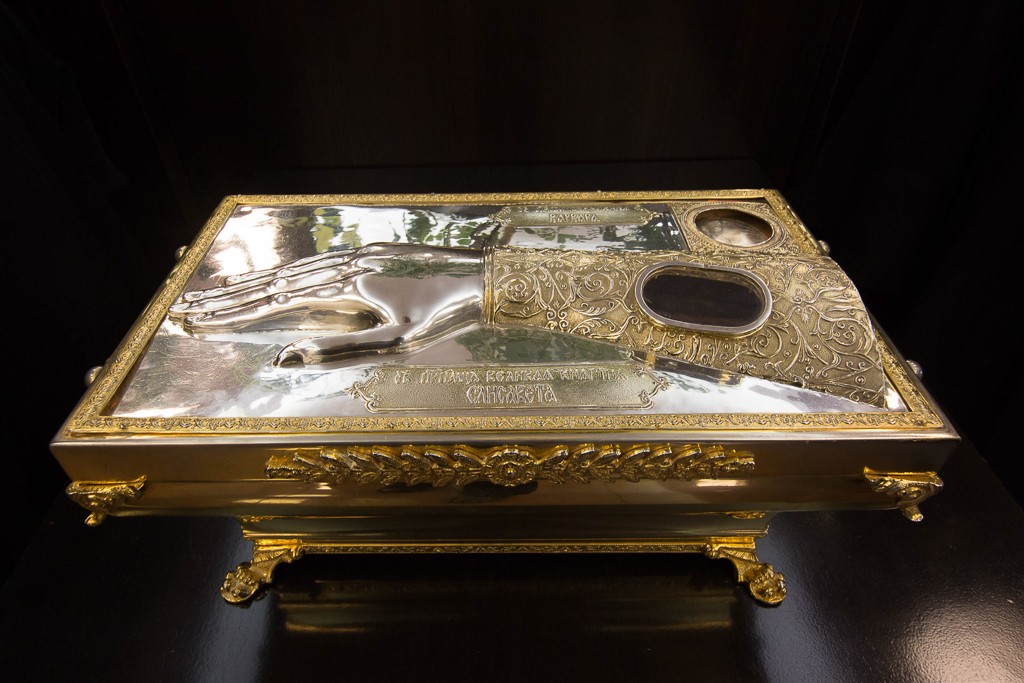 Святыню доставил из Знаменского Синодального собора Нью-Йорка председатель молодежного синодального отдела Русской Православной Церкви Заграницей протоиерей Андрей Соммер. В ковчеге также находится частица мощей мученицы инокини Варвары.