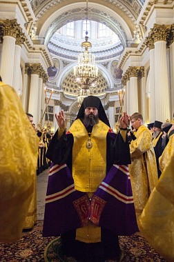 Его Высокопреосвященству сослужили: наместник Лавры епископ Кронштадтский Назарий; епископ Тихвинский и Лодейнопольский Мстислав; секретарь епархиального управления протоиерей Сергий Куксевич; благочинные и настоятели петербургских храмов, священники Санкт-Петербургской епархии.