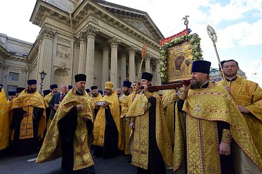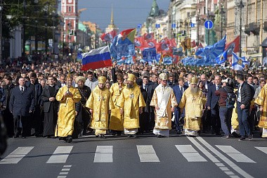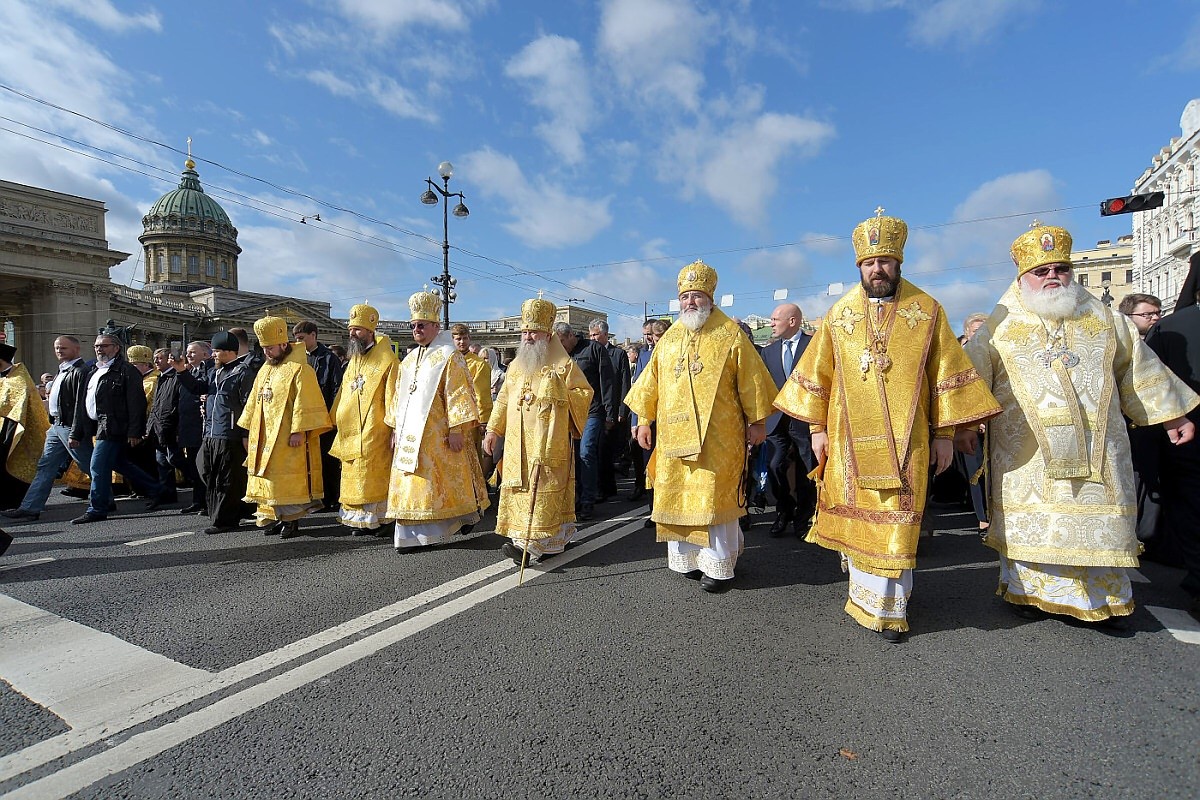 По окончании Божественной литургии в Казанском кафедральном соборе архиереи и сослужившее им духовенство возглавили молитвенное шествие по Невскому проспекту к площади Александра Невского.