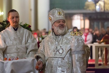 За пасхальной заутреней Владыка прочитал Огласительное слово святителя Иоанна Златоуста на Святую Пасху, которое уже более полутора тысяч лет звучит в храмах.