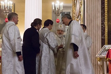 По запричастном стихе насельник Лавры игумен Сильвестр (Кирсанов) зачитал послание Святейшего Патриарха Московского и всея Руси Кирилла архипастырям, пастырям, монашествующим и всем верным чадам Русской Православной Церкви.