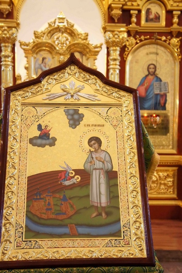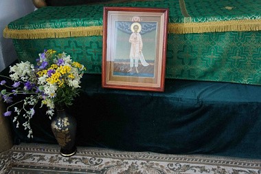 Паломники привезли цветы, хризантемы и розы, ими украсили центральный аналой, а раку отрока и его икону с частичкой мощей – букетом из полевых цветов.