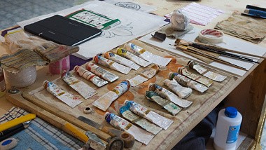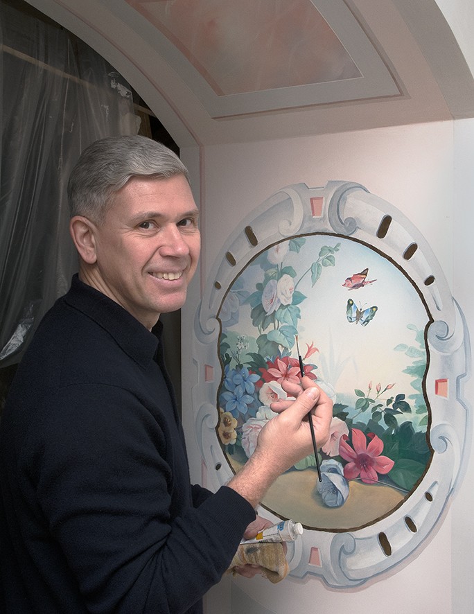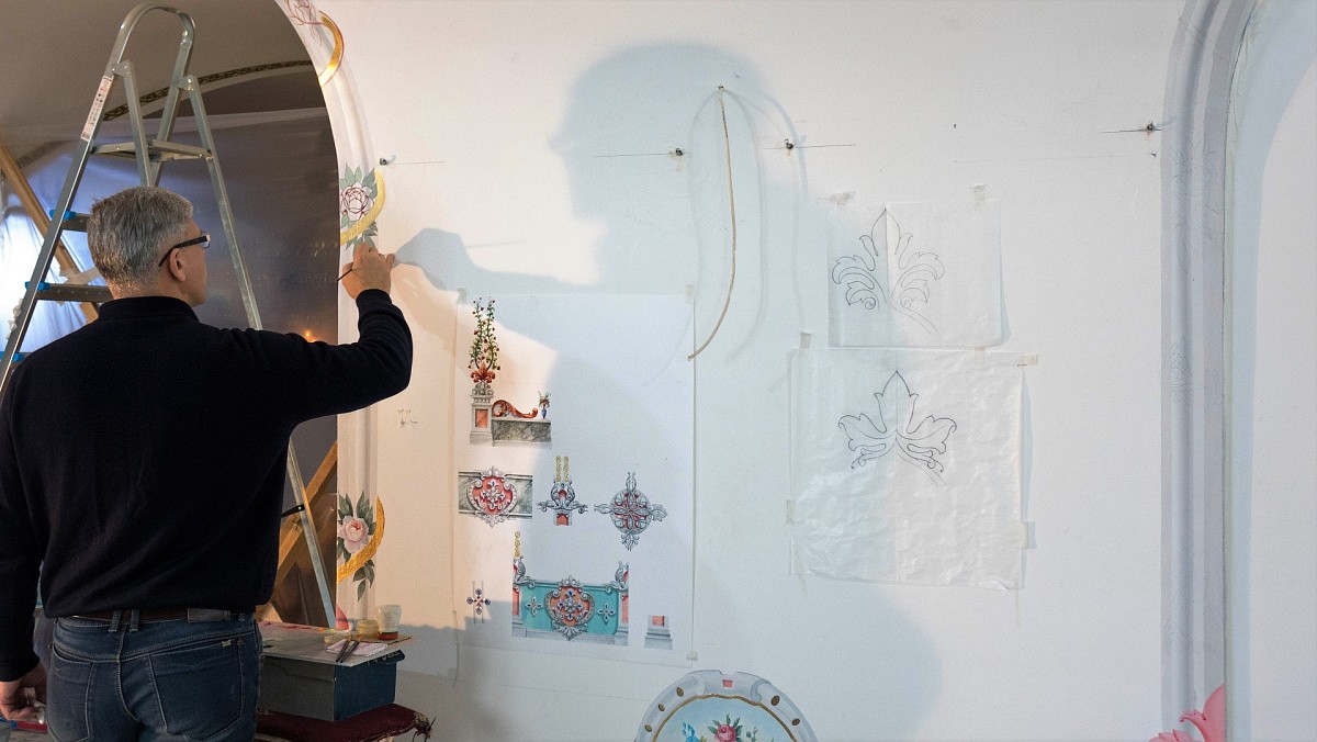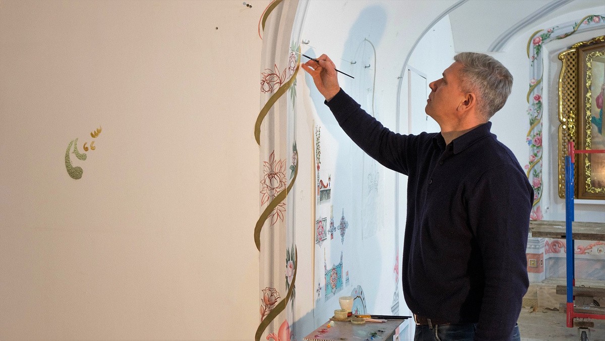 «Цель нашей работы – организовать и композиционно, и в цветовом решении всё убранство храма. Роспись включает несколько этапов. На подготовительном мы создаем эскизы: сначала они "расцветают" в нашей фантазии и в видении настоятельницы обители матушки Филареты, потом с ней же согласовываем все изменения», – рассказывает Дмитрий Соколов.