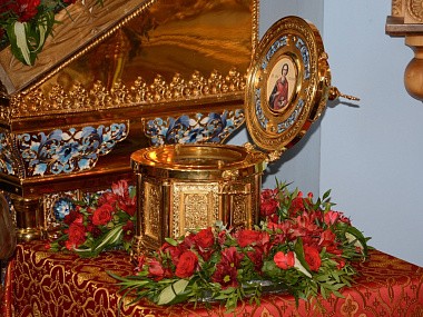 По окончании Литургии Его Высокопреосвященство возглавил торжественный молебен святому мученику и целителю Пантелеимону у ковчега с частицей мощей святого и крестный ход, во время которого обильно окропил многочисленных прихожан, паломников и гостей обители святой водой.