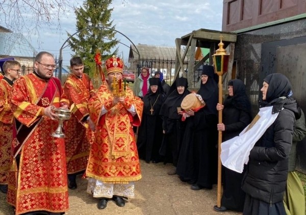 По окончании Литургии под колокольный звон был совершён крестный ход вокруг храма Рождества Иоанна Предтечи, после чего владыка Игнатий поздравил всех собравшихся с праздником Светлого Христова Воскресения и преподал всем благословение. Игумении Кирилле и сестрам для молитвенного поклонения архиерей преподнёс частицу святых мощей великомученика Георгия Победоносца.
