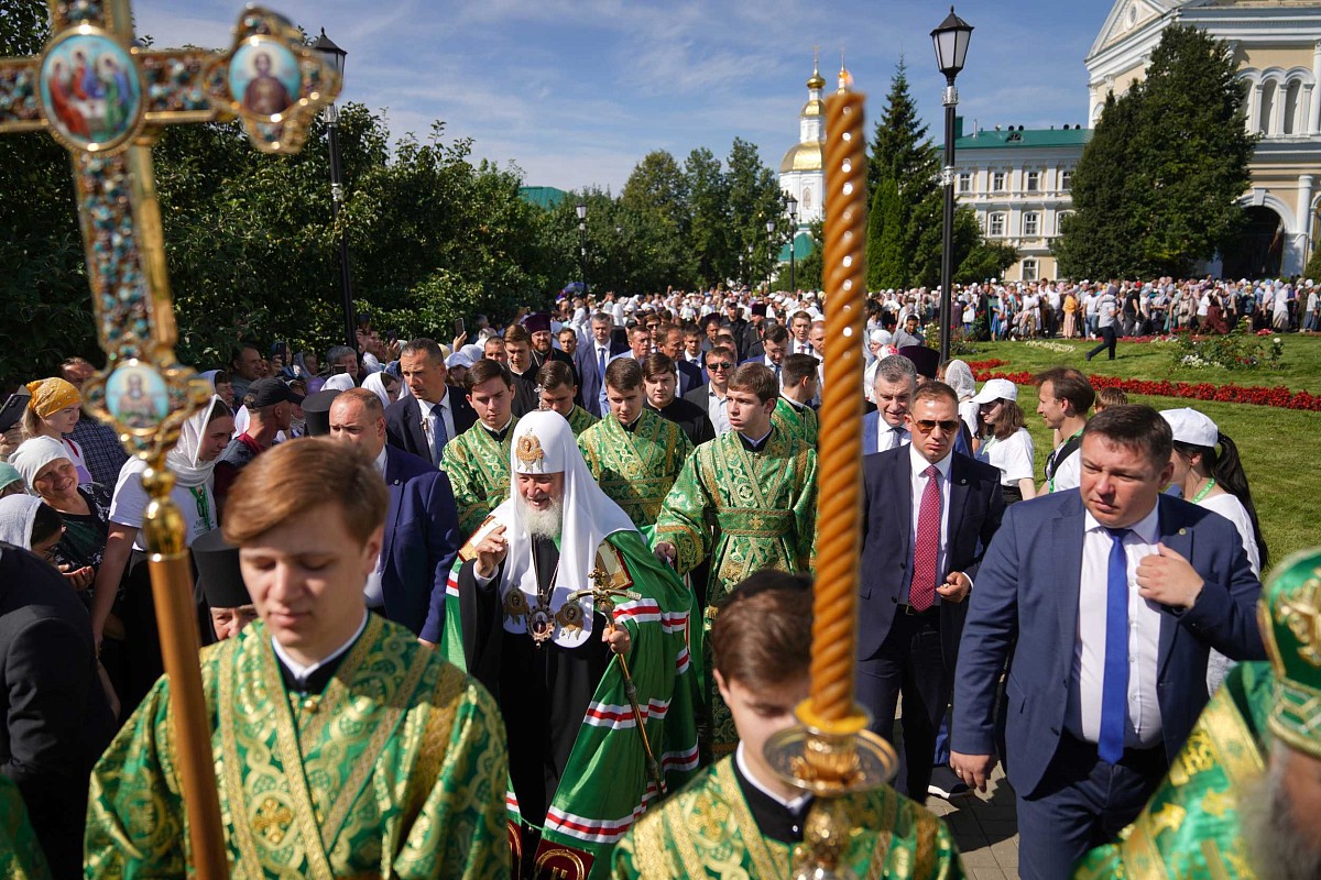 Святейший Владыка возглавил служение Божественной литургии под открытым небом на площади перед Преображенским собором монастыря у раки с честными мощами преподобного Серафима, по сложившейся традиции принесенными перед началом богослужения из Троицкого собора и поставленными за престолом.