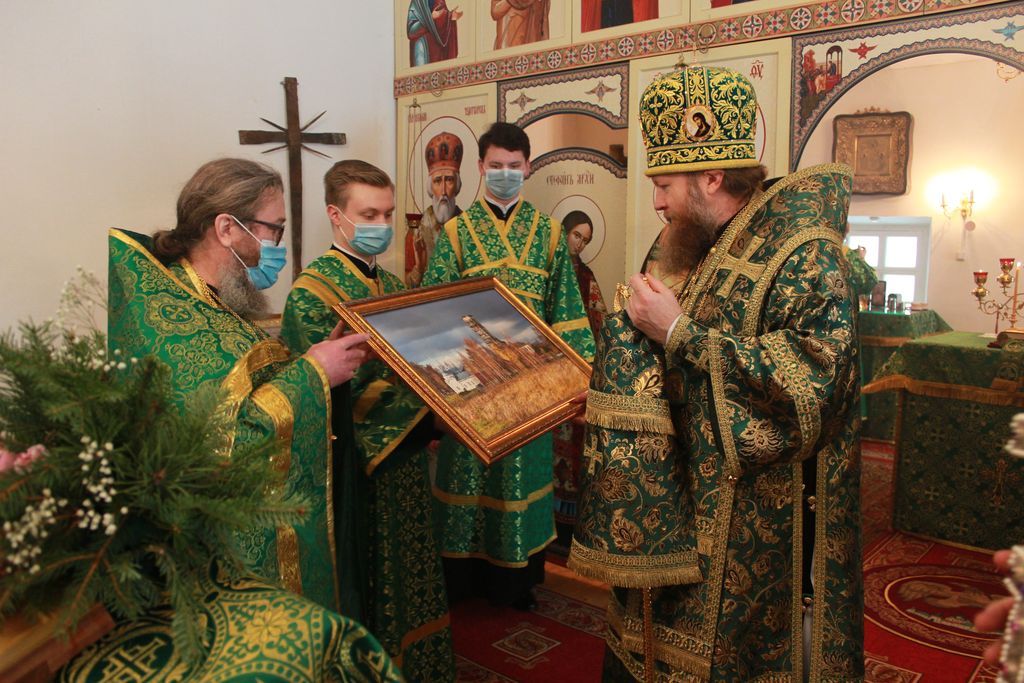 По окончании Литургии Высокопреосвященнейший владыка преподнес приходу храма Богородичную икону, всем молившимся вручил книги «Преподобный Мартиниан, Белозерский чудотворец» и сладкие подарки. Затем иеромонах Иларион подарил митрополиту Савве фотографию подворья, выполненную на холсте.