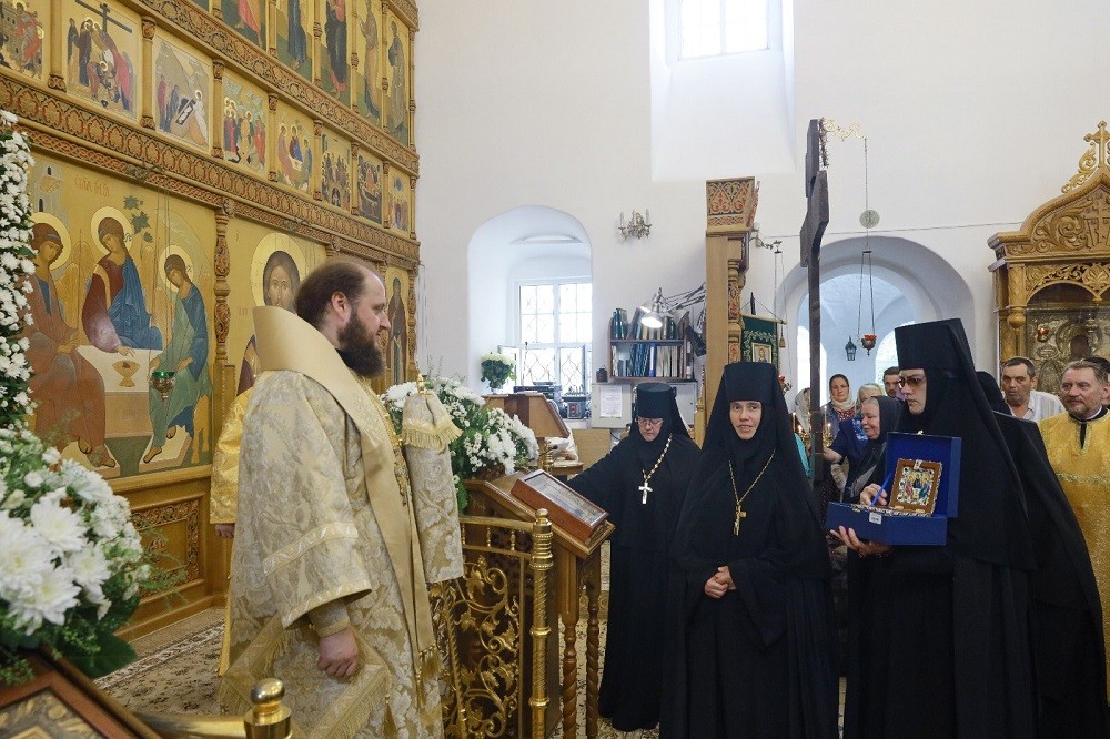 В завершении торжественного богослужения игумения Агния поблагодарила владыку за его архипастырский визит и в память об этом дне преподнесла Его Высокопреосвященству серебряный мощевик с изображением Святой Троицы и букет цветов. В свою очередь архиерей поблагодарил матушку настоятельницу за теплый прием и обратился к собравшимся с архипастырским словом.
