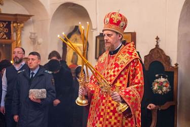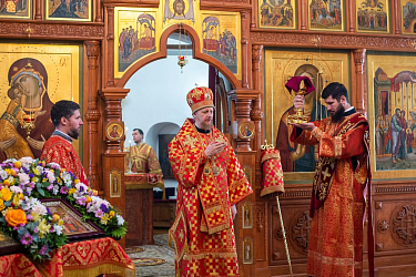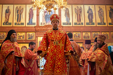 По окончании богослужения епископ Феоктист поздравил матушку игумению, насельниц, прихожан и паломников с днем памяти святого великомученика Феодора Стратилата и обратился к собравшимся со словом проповеди.