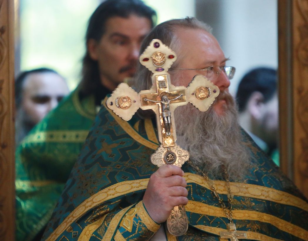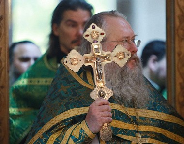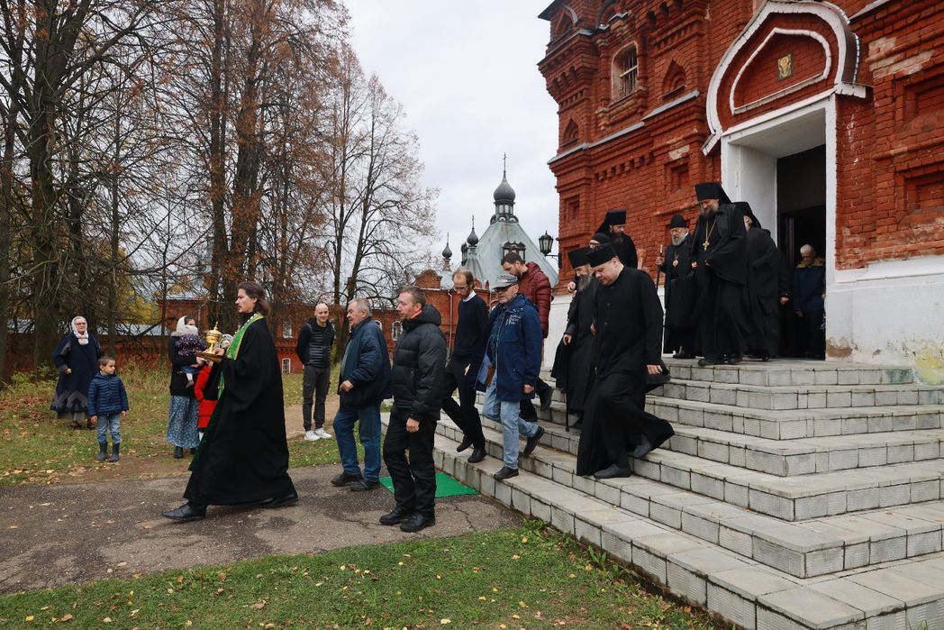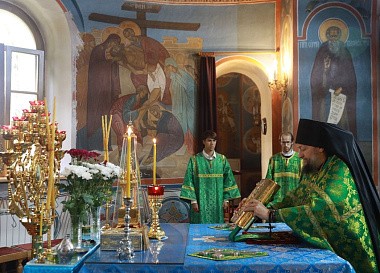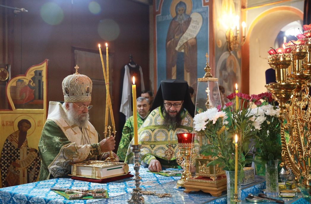 Его Преосвященству сослужили благочинный монастырей игумен Серафим (Котенёв), настоятель монастыря игумен Серафим (Семилетов) и братия обители в священном сане.