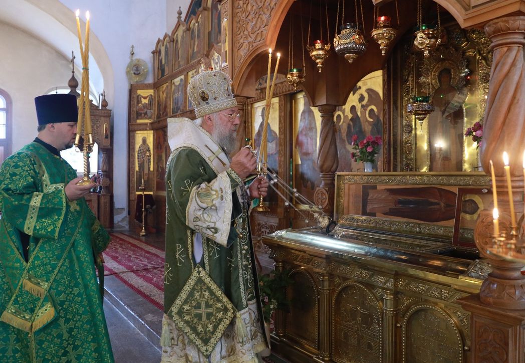 Епископ Иннокентий приложился к мощам и обратился к собравшимся с архипастырским словом. В своем слове владыка поздравил насельников и прихожан с днем памяти небесного покровителя обители.