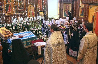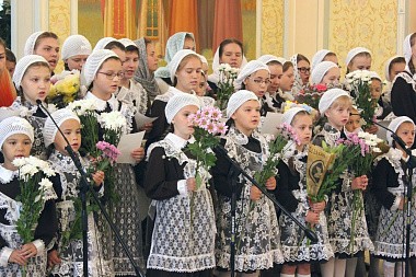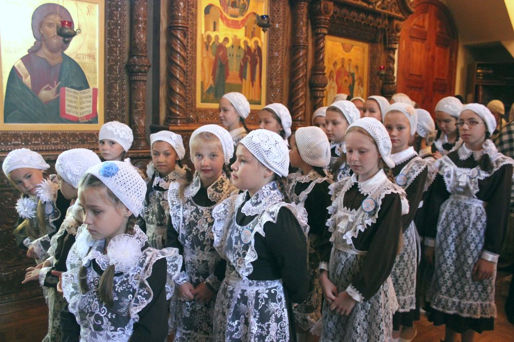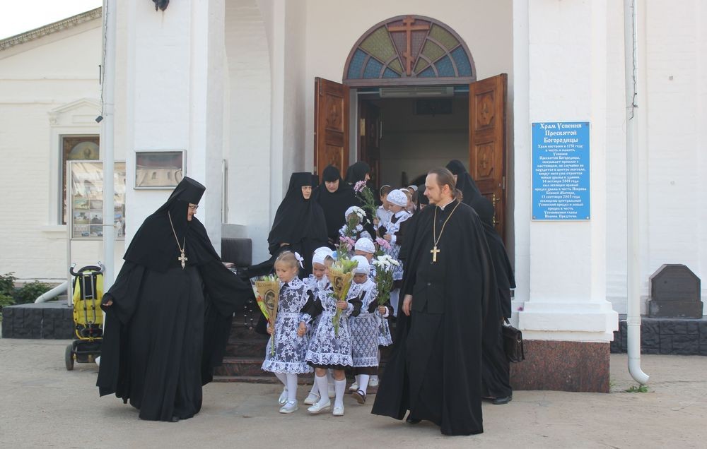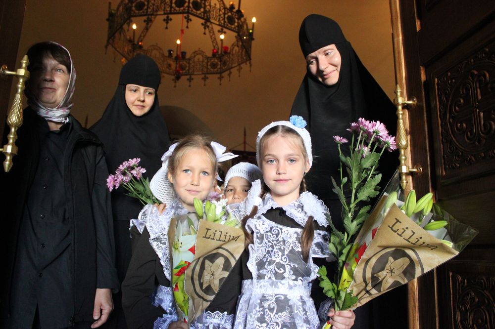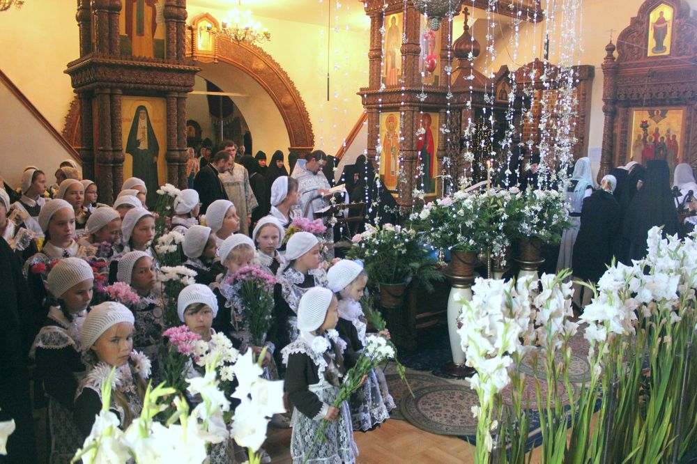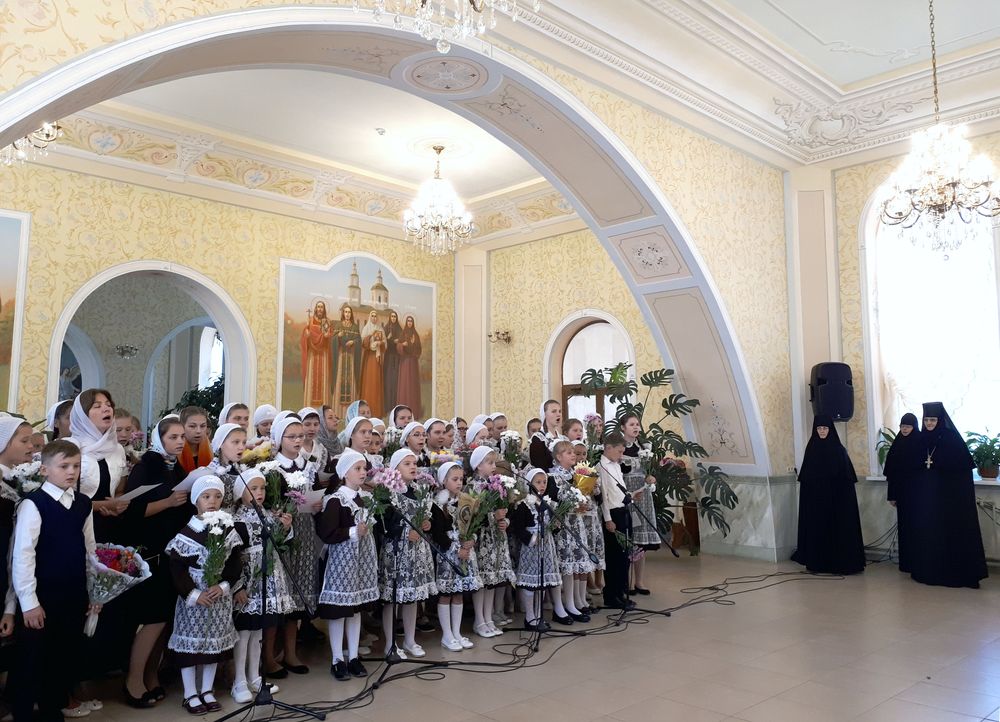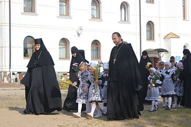 Новый учебный год начался с молебна в Успенском храме обители. По окончании молебна девочки в сопровождении настоятельницы монастыря игумении Еротииды (Гажу), священника и сестер прошли на торжественную линейку в Варваринскую трапезную. Линейка началась с пения Гимна России.