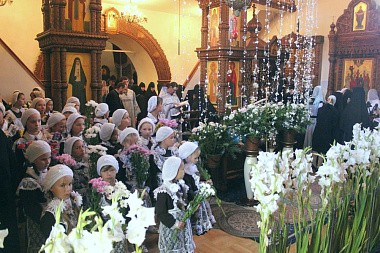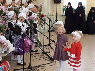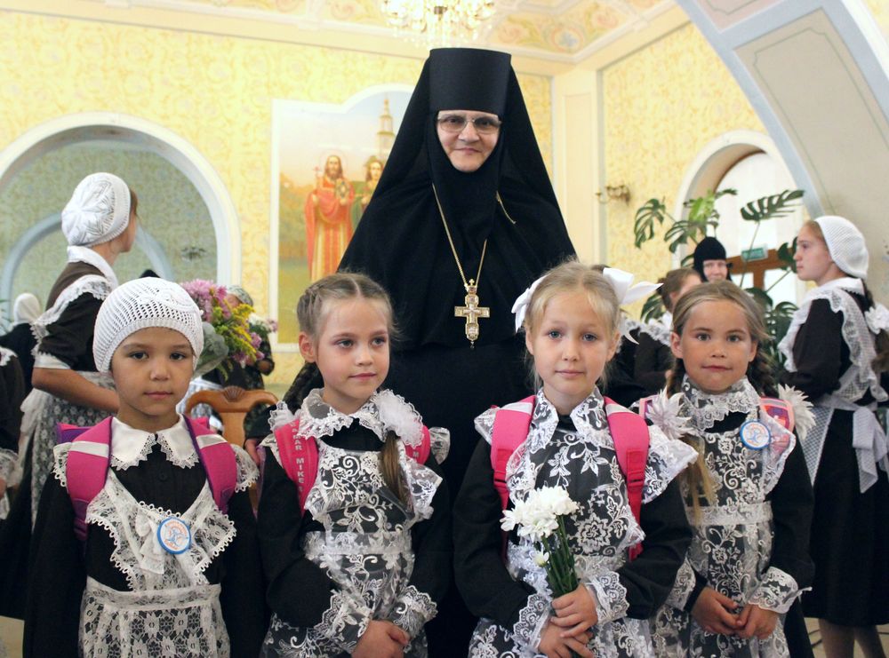«Дорогие друзья! Наконец-то наступил этот долгожданный день, и вы все такие нарядные, в белых фартучках, пришли на линейку. Поздравляю вас с началом учебного года, с Днем знаний. Вы будете получать и осваивать знания для пользы нашей Родины, для пользы Церкви и монастыря. Стремитесь, чтобы вас украшала культура православной веры.