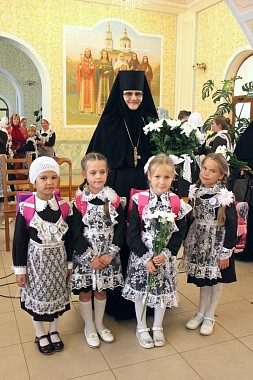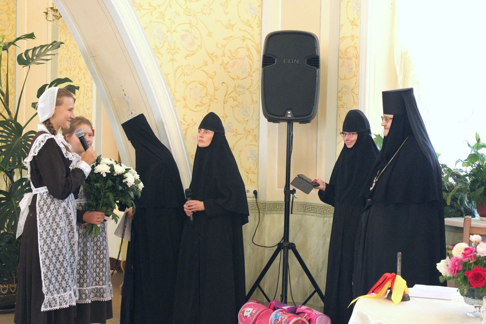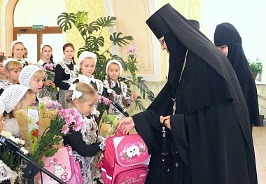 Старшие воспитанницы поздравили матушку игумению и подарили ей цветы, а первоклассницы прочитали заранее подготовленные стихи. Игумения Еротиида подарила первоклассницам портфели, в которых было собрано всё необходимое для школы.
