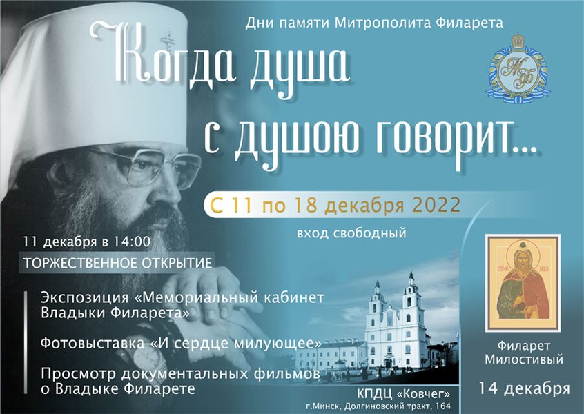 С 11 по 18 декабря 2022 года в духовно-просветительском центре «Ковчег» Елисаветинского женского монастыря города Минска пройдут дни памяти первого Патриаршего экзарха всея Беларуси митрополита Филарета (Вахромеева), приуроченные ко дню ангела владыки, который отмечается 14 декабря.