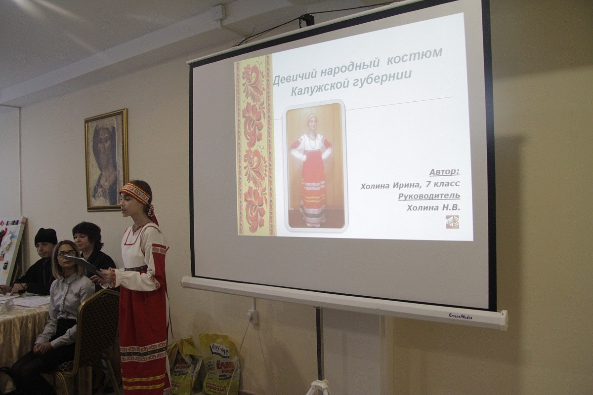 Секция для младших и средних школьников включила в себя красочные творческие презентации. Ученик 5 класса Спасо-Суходревской школы Данила Красовский рассказал о месте рождения Патриарха Пимена; ученики 4 класса этой же школы Никита Костриков и Анастасия Зенова поведали о семейной истории первой учительницы их сельской школы – дочери священнослужителя. Самый младший участник секции Алексей Кошманов, ученик 3-го класса Малоярославецкой МБОУ СОШ № 2, для презентации своего доклада об истории памятника полковому священнику Василию Васильковскому для лучшего погружения слушателей в атмосферу эпохи надел мундир образца 1812 года. Ученица 5 класса Анна Багрова, для представления своего проекта тоже надевшая костюм, в данном случае народный, рассказала о значимости изучения истории кукол для понимания истории своего народа и продемонстрировала кукол, сделанных вместе с одноклассницами своими руками. Ученица 7 класса Кудиновской школы Ирина Холина также продемонстрировала на себе изготовленный своими руками народный костюм и подробно объяснила, как должен выглядеть девичий костюм Калужской губернии. Ученица Детчинской школы Анастасия Валишина рассказала об особо охраняемой природной территории Малоярославецкого района – усадьбе Белкиных в с. Дольском.
