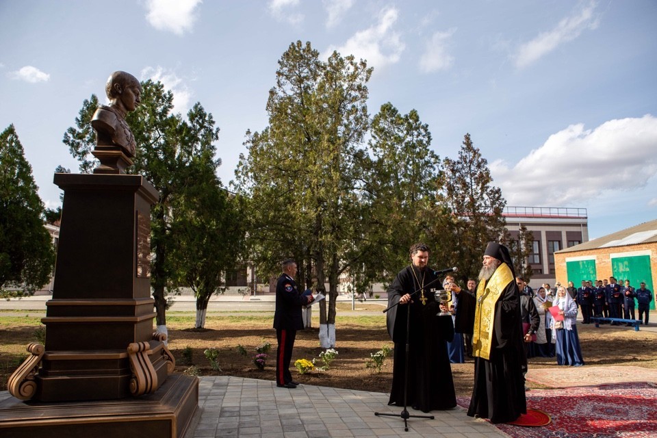 Приветствуя участников церемонии, архиепископ Юстиниан подчеркнул важность почитания памяти святого страстотерпца Алексия, который при земной жизни был шефом всех казачьих войск Российской империи, а в наши дни почитается как небесный покровитель казачьей молодежи: «В дореволюционной России начала ХХ века среди народов, населяющих великую державу, сложилось трогательно-благоговейное отношение к царской семье. Вся страна переживала, что у царственных супругов долго не было наследника – четыре дочери родились у них перед появлением на свет цесаревича Алексия. Царская семья скорбела и молилась, ездила по святым местам. Народ сопереживал им. Когда же произошла долгожданная радость и родился царевич Алексий, то по этому поводу были торжества по всей России. В буддийской среде бытовало мнение, что Михаил Федорович, родоначальник Дома Романовых – это перерождение одного из учеников Будды. В жизнеописании Будды есть такой эпизод, когда он привлек к себе в последователи двоих братьев-купцов. И вот ламы говорили, что один из этих братьев переродился в Михаиле Федоровиче Романове, а второй стал родоначальником Китайской императорской династии. Традиционно каждый член императорской семьи становился шефом того или иного рода войск, того или иного подразделения. Юный наследник же стал шефом – верховным атаманом всех казачьих войск России. В память об этом в Казачьем кадетском корпусе Городовиковска воздвигнут на высоком постаменте бюст святого цесаревича Алексия. Казак – это не столько по крови передающаяся принадлежность, сколько особое расположение ума и души. Казак волен, смел, хранит веру и традиции предков, любит свою Родину, старается защитить слабого и беззащитного. И дай, Боже, чтобы юность воспитанников Казачьего кадетского корпуса проходила под покровительством святого цесаревича Алексия, чтобы они могли молитвенно обратиться к нему со своими переживаниями и скорбями, потому что он поймет их молодость и поможет им».