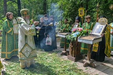 В тот же день, по многолетней традиции, на святом источнике в скиту в честь иконы Божией Матери «Живоносный источник» архипастырями и собором духовенства был отслужен водосвятный молебен.