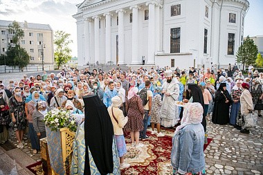 Богослужение совершалось на центральной площади перед собором Казанской иконы Божией Матери на месте явления чудотворного образа Царицы Небесной.