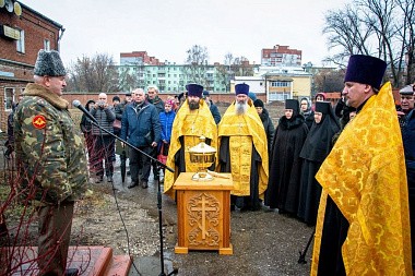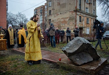 После освящения владыкой памятного знака все собравшиеся возложили к его подножию алые гвоздики.