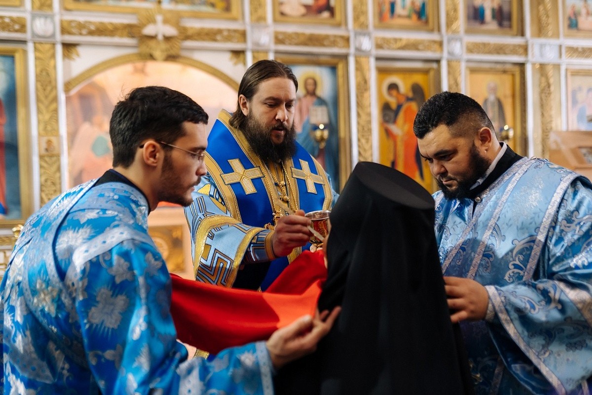 Его Преосвященству сослужили клирик кафедрального собора Вознесения Христова г. Магнитогорска иерей Максим Малюшкин и благочинный Кизильского округа протоиерей Андрей Стадник.