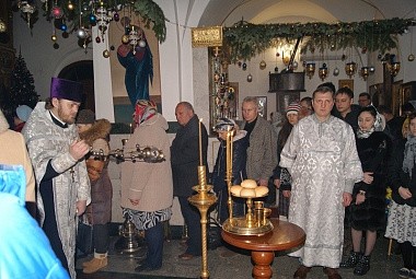 Монастырские храмы были заполнены молящимися. Во дворе перед храмом сестры устроили и украсили рождественский вертеп.