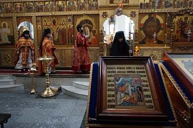 За богослужением молились настоятельница монастыря игумения Неонилла (Кузьмина) с сестрами. Богомольцы-миряне слушали службу по аудиотрансляции во дворе в связи с карантином из-за коронавирусной инфекции. При совершении богослужений в обители соблюдаются все рекомендованные врачами санитарно-гигиенические нормы.