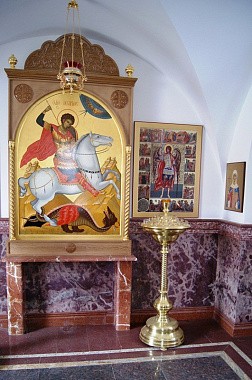 На монастырском подворье вмч. Георгию Победоносцу посвящена часовня-колокольня, главную икону которой в 2017 году создал иконописец Валерий Поляков: на иконе святой Георгий изображен на белом коне, побеждающим древнего змия – диавола.