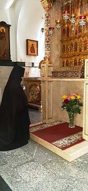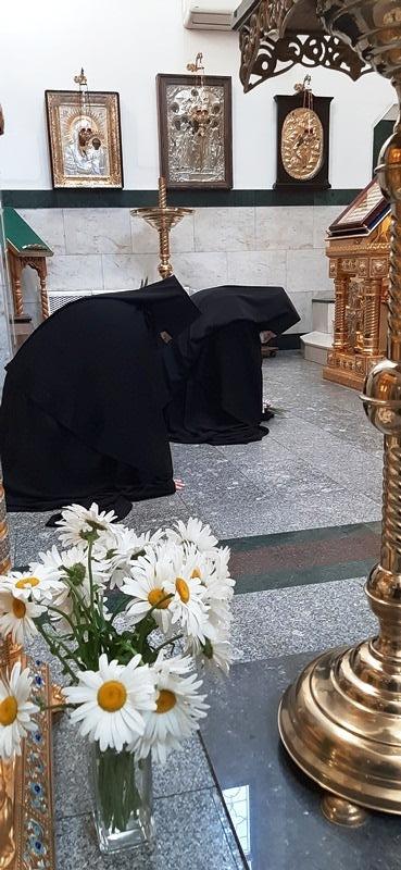 Храмы и монастырский двор были украшены цветущими растениями и колосьями пшеницы, в городе сестры выложили зеленую дорожку от ворот к храму.