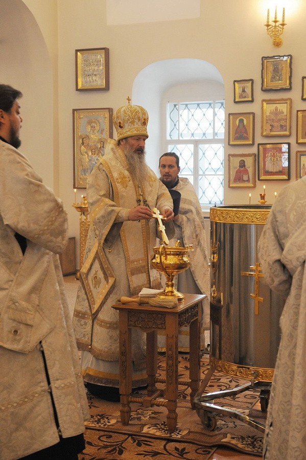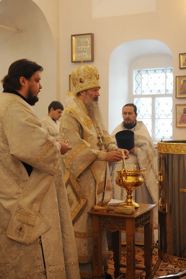 Его Высокопреосвященству сослужили благочинный Свято-Трифонова монастыря игумен Вениамин (Веселов), клирики Спасо-Преображенского храма протоиерей Андрей Лебедев и протоиерей Димитрий Кириллов.