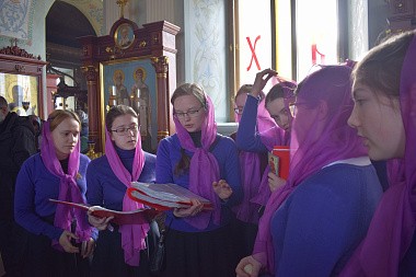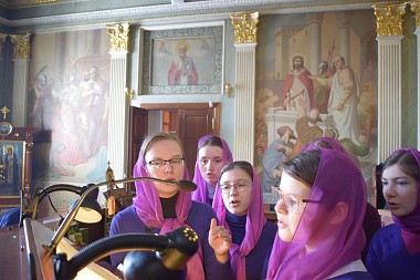 В этот день в обители были совершены две Божественные литургии: ранняя, за которой пели насельницы монастыря, и поздняя, песнопения которой по благословению настоятельницы монастыря игумении Филареты (Гажу) исполнили воспитанницы Воскресной школы обители.