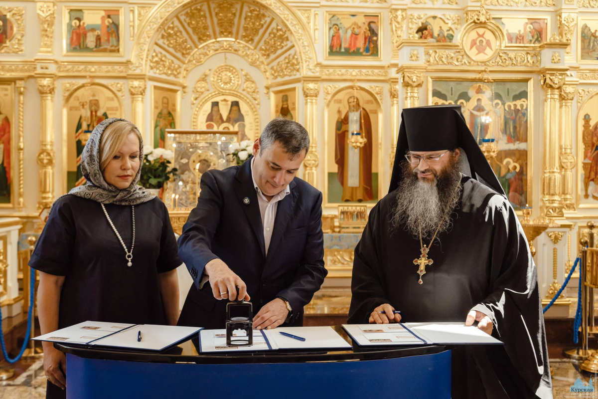 Оттиск специального штемпеля первыми на марки поставили временно исполняющий обязанности губернатора Курской области Александр Хинштейн, настоятель Горнальского Белогорского монастыря игумен Питирим (Плаксин), исполняющая обязанности директора УФПС Курской области Светлана Картамышева.