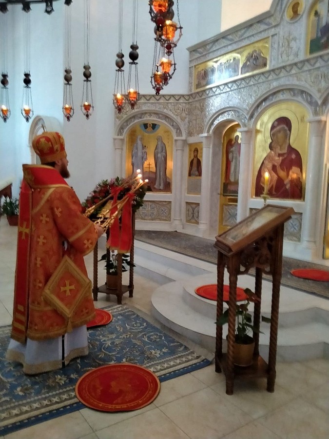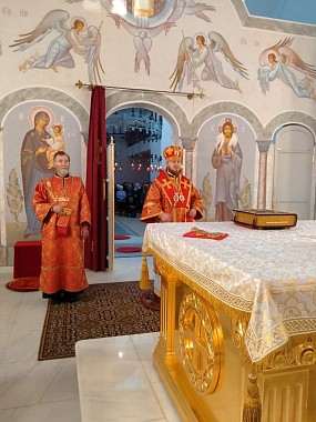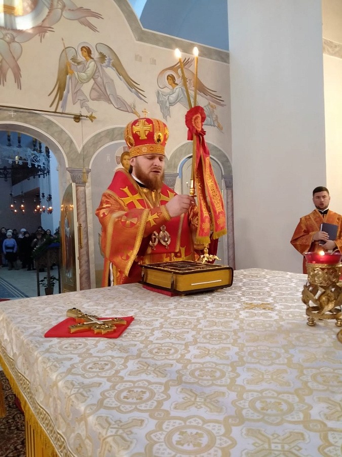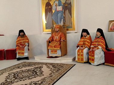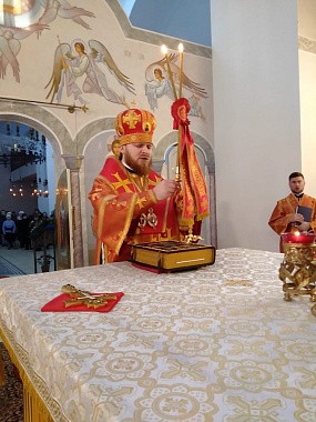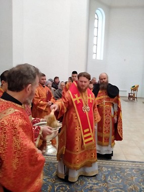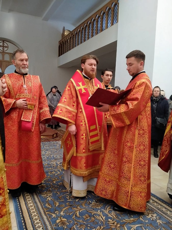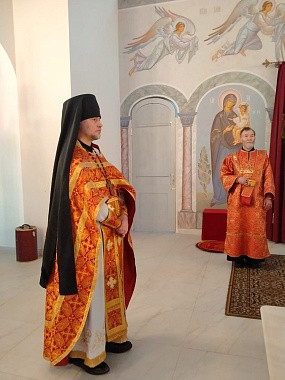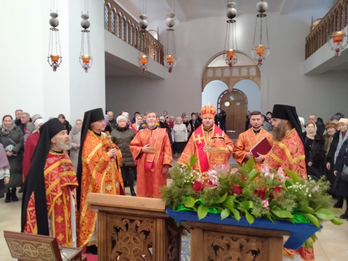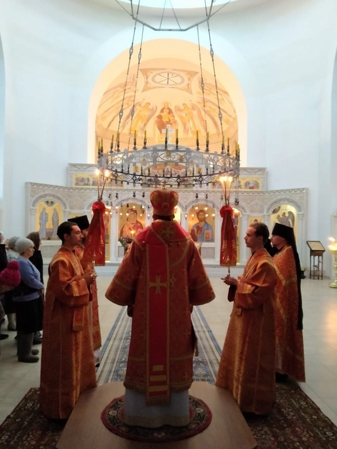 Его Преосвященству сослужил настоятель монастыря игумен Моисей (Пилатс), клирики обители иеромонахи Макарий (Чибисов) и Варсонофий (Молчанов), а также диакон Владимир Коркодинов.