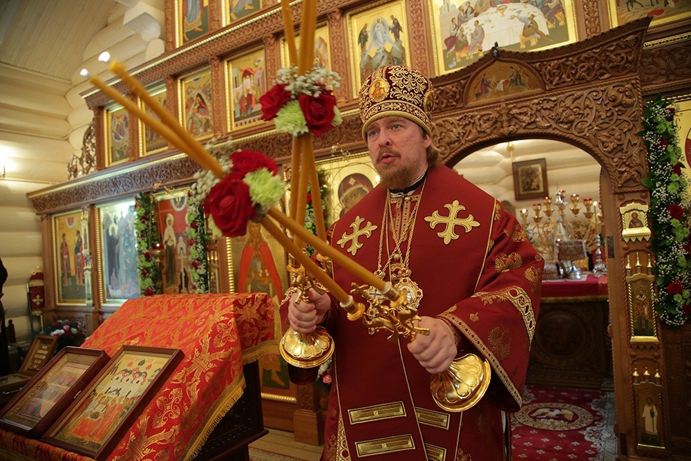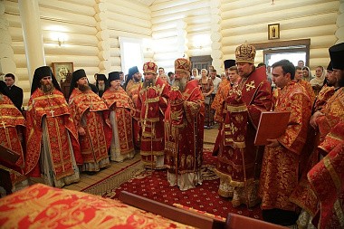 Владыка отметил, что сегодня впервые совершена служба в этом вновь построенном храме. В минувшем году после Царских дней храм пострадал от поджога. Его Высокопреосвященство поведал, что было принято решение возвести на этом святом месте новый храм подобно лучшим образцам российского храмового зодчества, неоднократно воссоздаваемым после пережитых драматических событий.