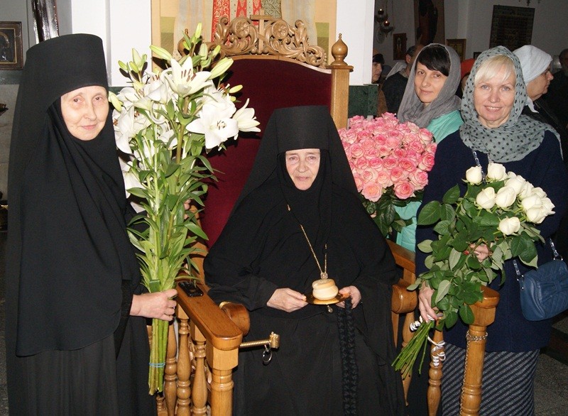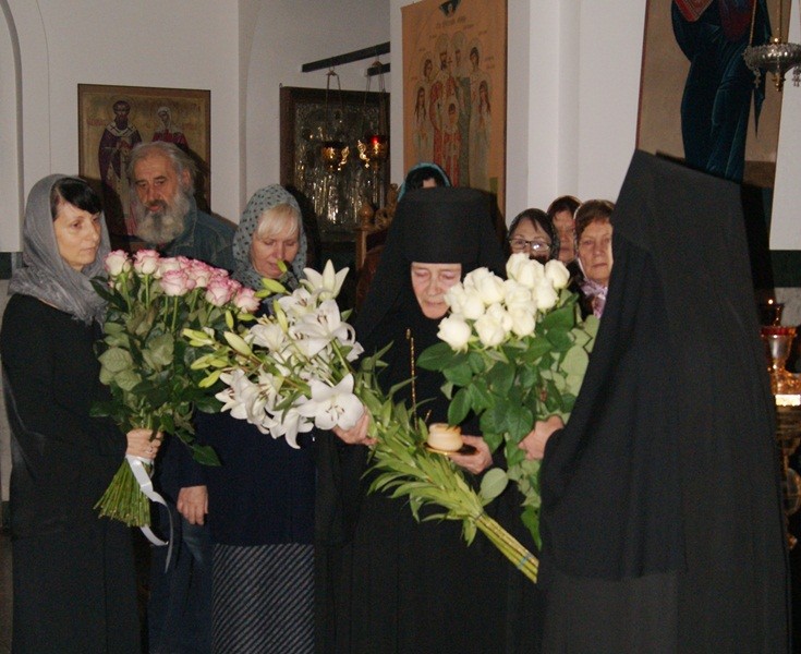 Сестринский хор исполнил византийским распевом многолетие. Насельницы и прихожане монастыря поздравили его настоятельницу и преподнесли Ее Высокопреподобию цветы.
