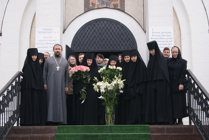 По окончании Литургии иерей Олег Криволап произнес проповедь о подвиге святой мученической семьи, а затем от имени клириков обители торжественно поздравил основательницу монастыря «Всецарица» игумению Неониллу с днем Ангела.