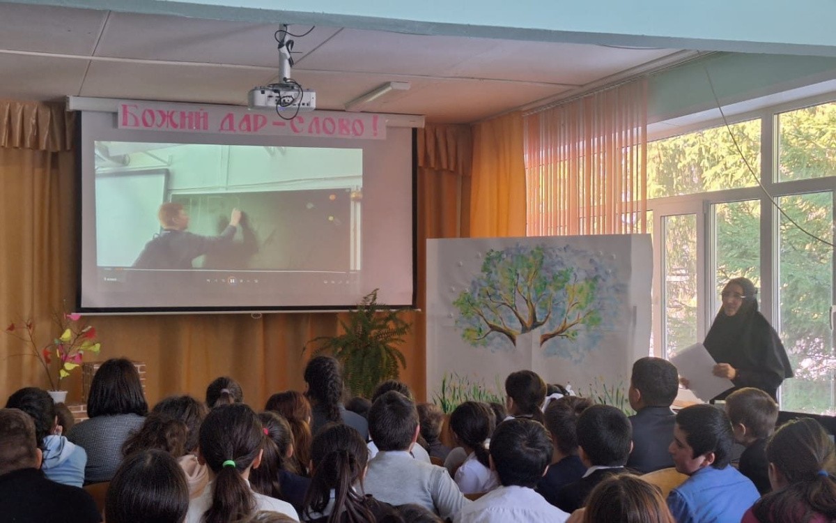 Для учеников Рождественской СОШ Калининского муниципального округа прошел праздник «Божий дар – слово». Он был подготовлен руководством школы совместно с Вознесенским Оршиным женским монастырем в поселке Орша. Участвовали все ученики от первого до одиннадцатого классов, приехали также в гости на праздник школьники из Каблуковской школы – собралось более ста человек. Дети познакомились с многообразием лексики родного языка; изучили «вежливые слова», стихи и отгадывали специальный кроссворд, выполняли занимательные задания, записали видеоотчеты о прочитанном рассказе; общими усилиями был создан мультипликационный фильм по стихотворению М. Алимбаева «Урок вежливости». Каждый класс – с 1 по 11 – выполнил иллюстрацию к понравившейся пословице, а семиклассники написали свои рассказы.