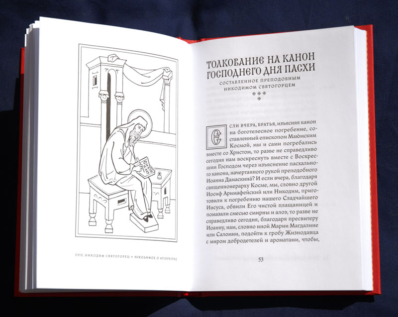 Преподобный Никодим Святогорец как человек энциклопедических познаний, толкуя канон, не ограничивался рамками содержания того или иного тропаря, но сообщал читателю также много важных богословских и церковно-практических сведений (например шесть причин, по которым зажигаются в церкви свечи), указывал и других авторов, возбуждая интерес к ним. Зачитанные в рамках презентации небольшие фрагменты из книги продемонстрировали изящную византийскую риторику, плавную и торжественную, прекрасно переведенную на русский язык.