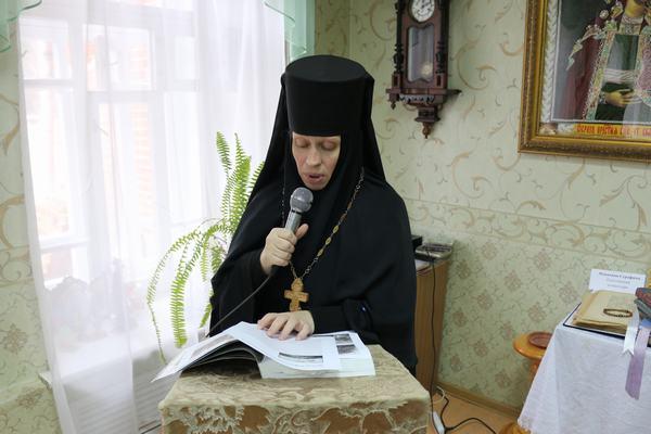 С докладами выступили: настоятельница Выксунского Иверского женского монастыря игумения Антония (Миронова) на тему «Преподобный Варнава Гефсиманский и его духовное наследие»; старшая сестра Свято-Троицкого Островоезерского монастыря монахиня Серафима (Беляева) с докладом, посвященным духовному наследию преподобного Серафима Саровского; настоятельница Абабковского в честь Святого великомученика Николая воина и великомученика Георгия женского монастыря игумения Никона (Желякова) с выступлением об особенностях устава Серафимо-Дивеевского монастыря.